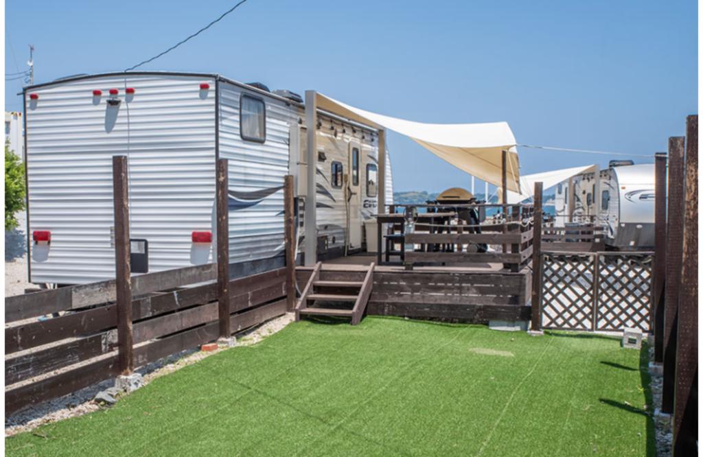 施設内には海を望むトレーラーハウスや大型ドームテントがあります。