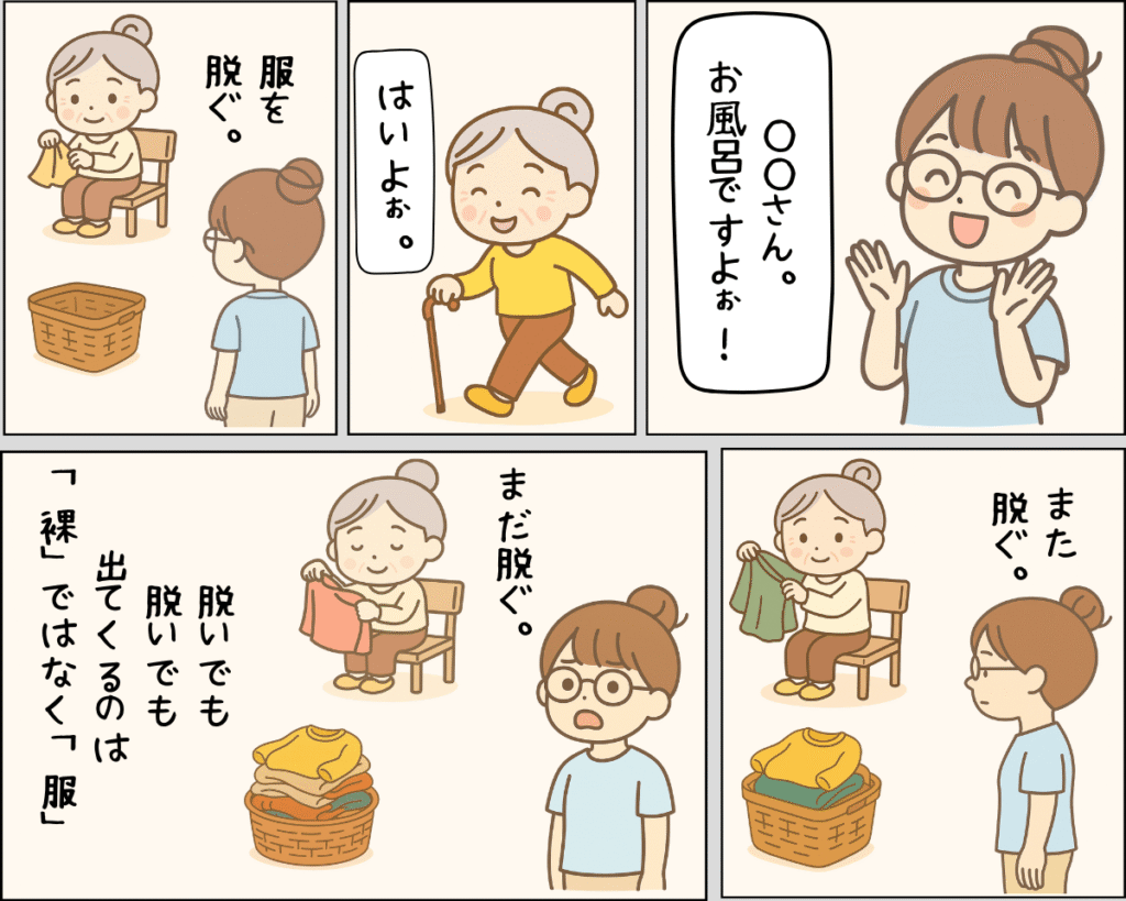 けっこう動ける身軽なおばあちゃんだったので、服を脱いでいるところを見守りしていた私。