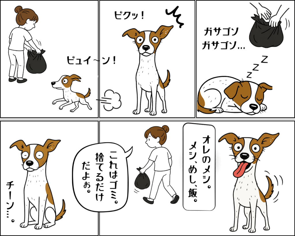 愛犬は、飼い主がキッチンでビニール袋などを“カサッ”と、少しでも音を立てると、寝てようが遊んでいようが、凄いスピードでダッシュしてきます。