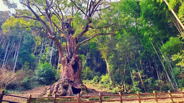 この大楠は、本殿裏手にある竹林を抜けた先に姿を現し、その巨大な姿と神秘的な雰囲気からパワースポットとして注目されています。