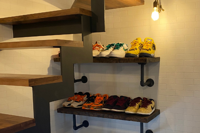 古着やスニーカーなどの趣味のコレクションを飾って楽しむ『見せる収納』を取り入れると、レトロな雰囲気が漂い、古き良きアメリカンヴィンテージの世界観を表現できます。